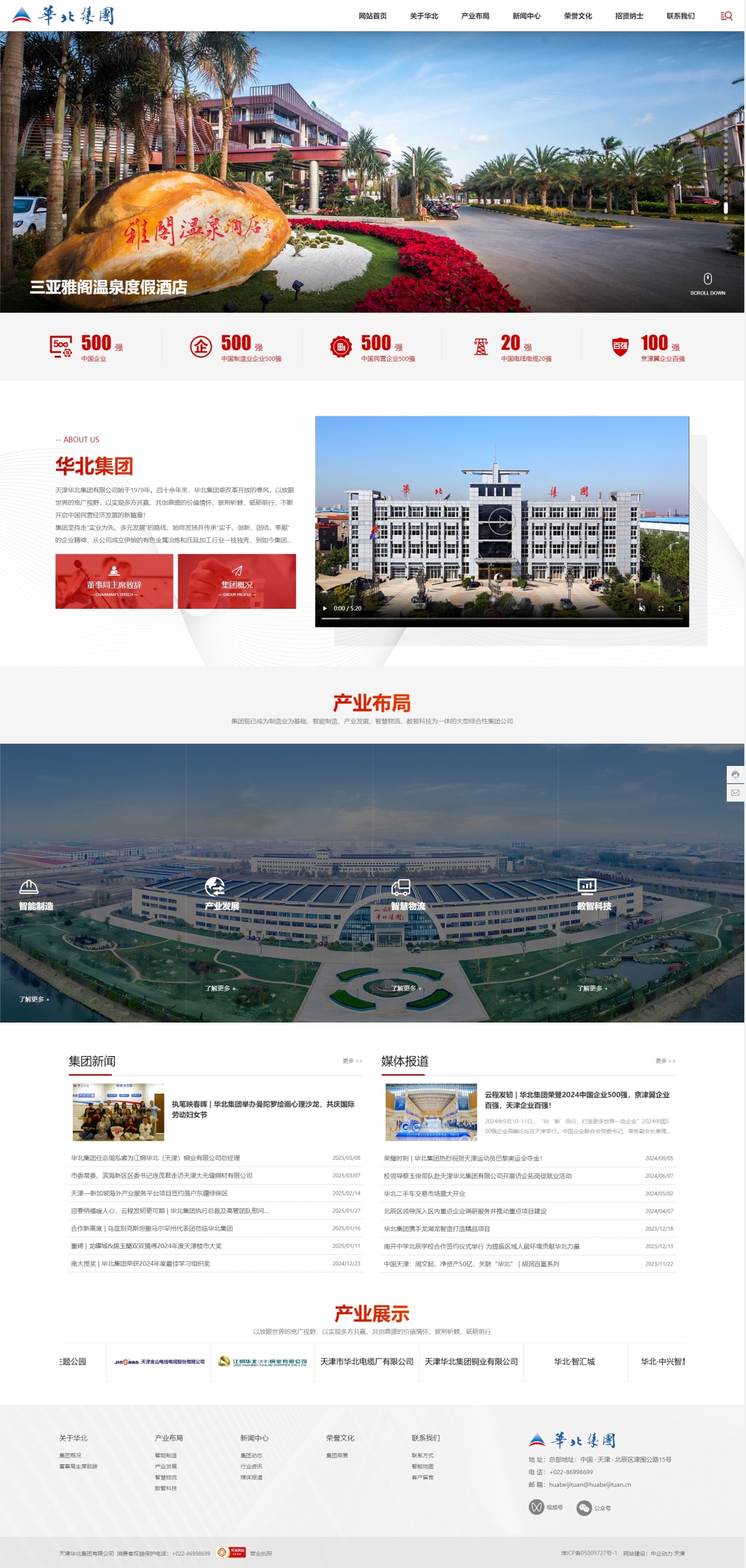 天津华北集团有限公司始于1979年,始终坚持实业为先,多元发展。现已成为制造业为基础,智能制造、产业发展、智慧物流、数智科技为一体的大型综合性集团公司。连续多年荣列:中国企业500强、中国制造业企业500强、中国民营企业500强、中国民营企业制造业500强、中国电线电缆20强、天津市百强企业、天津市制造业60强、中国民营企业文化建设十大标杆单位。集团现有近50家子公司,拥有核心专利技术近300项。